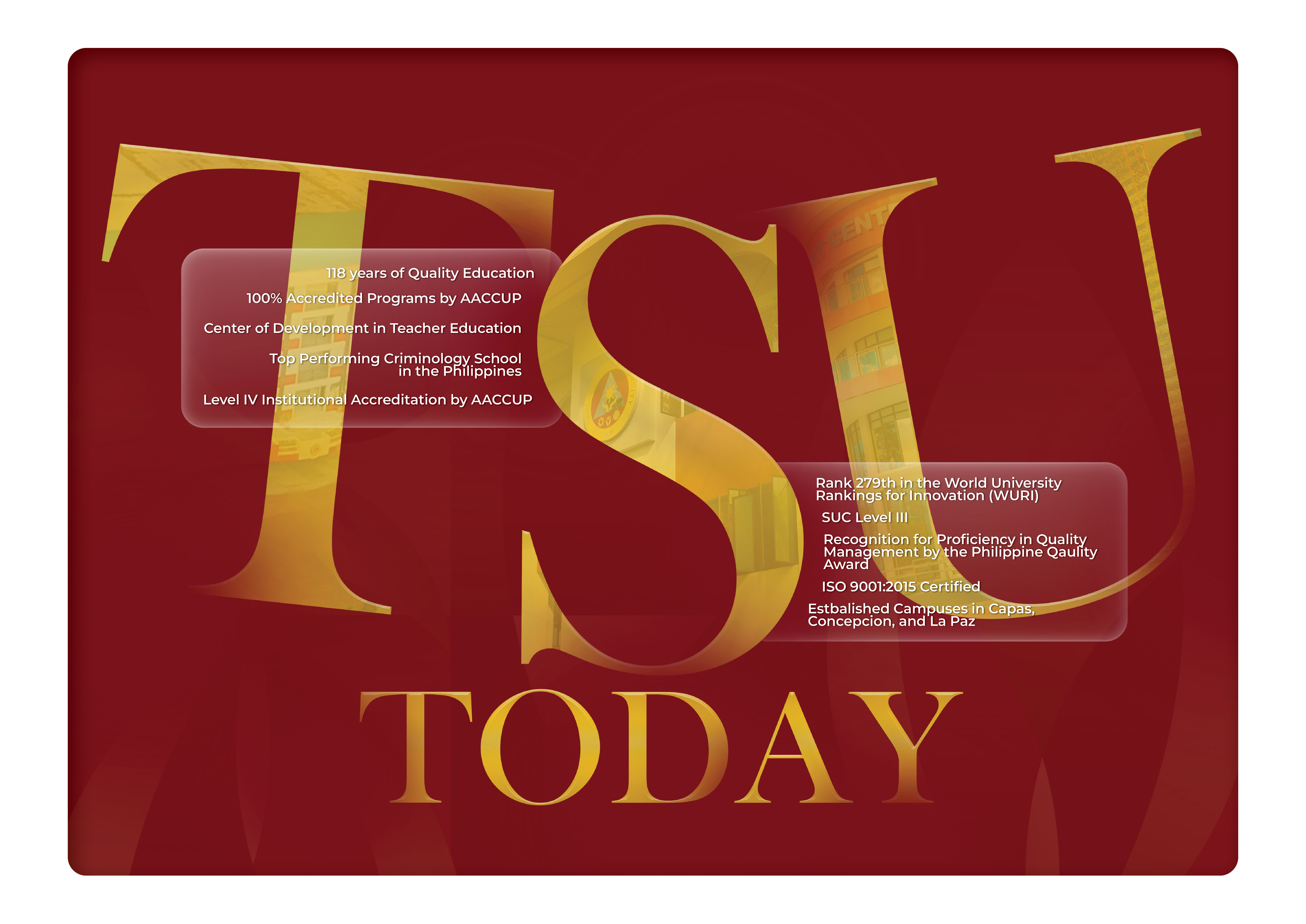 Furthermore, TSU is currently a holder of a Level IV Institutional Accreditation (IA), with 100% accredited programs, from the Accrediting Agency of Chartered Colleges and Universities in the Philippines, Inc. (AACCUP). To add, TSU is the first SUC in Region III to attain the highest level of AACCUP Institutional Accreditation.